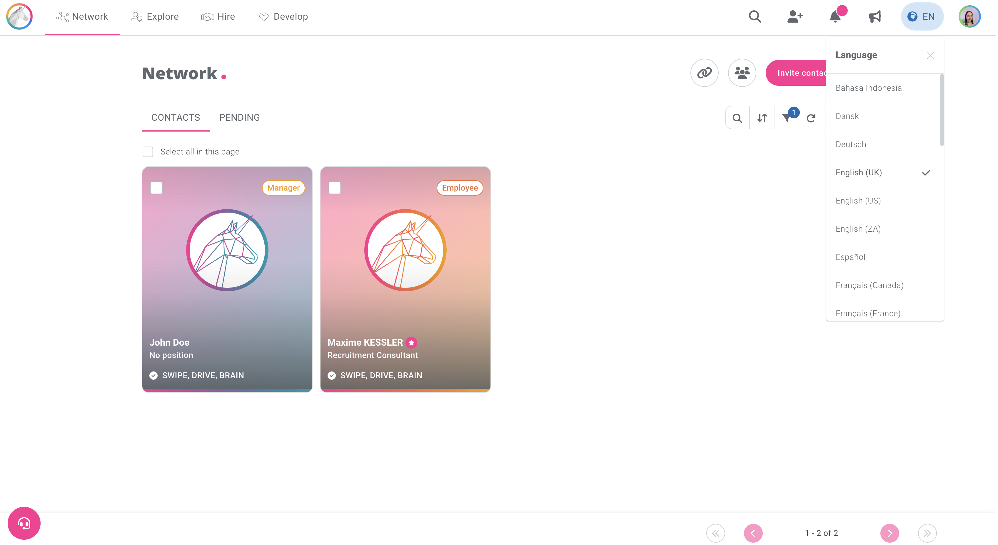 To change the language of your account, click on the small planet at the top right of your AssessFirst account. A drop-down menu will open, giving you a choice of 30 languages.