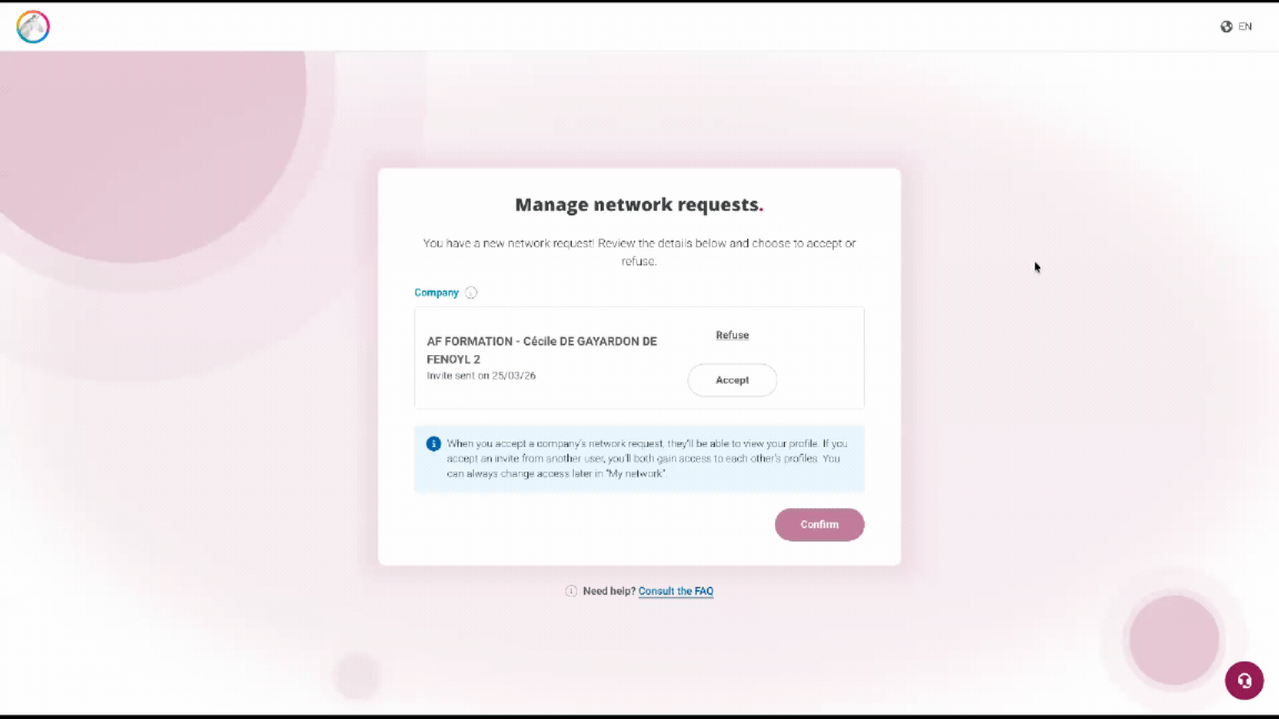 If you have been invited by a company, you must click “Accept” or ‘Refuse’ and then “Confirm.”