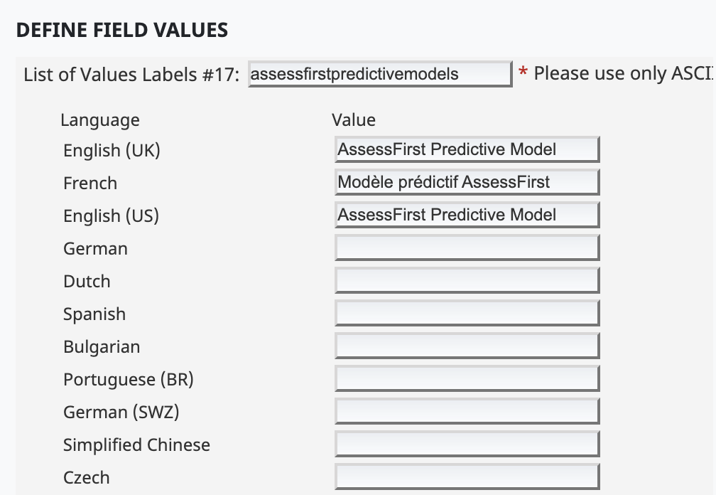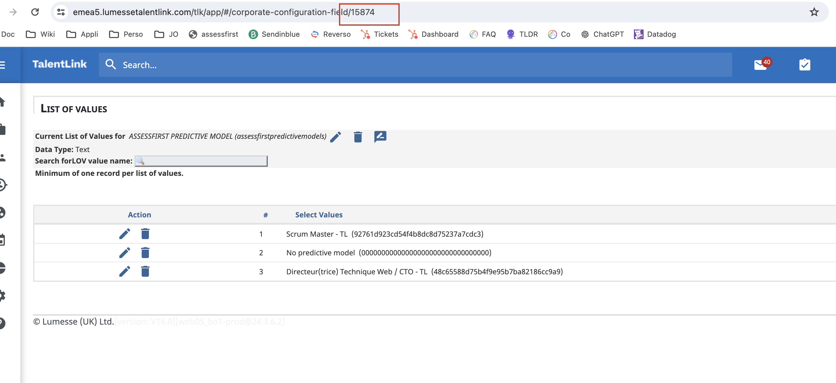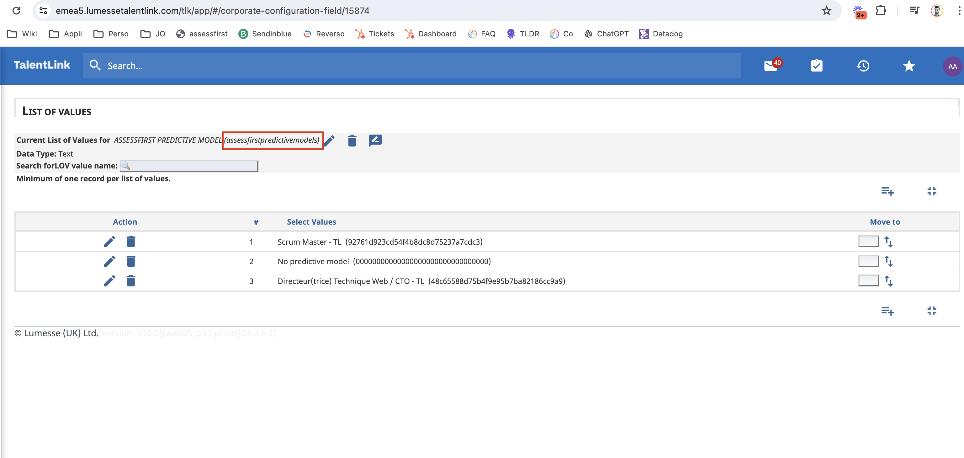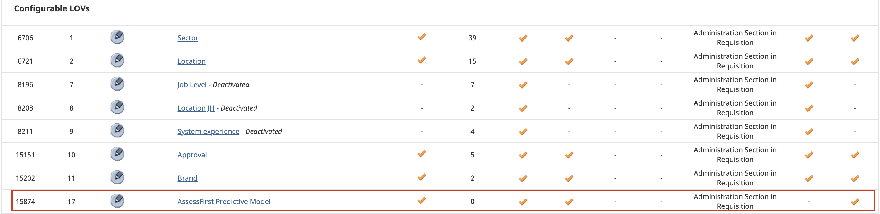 • Value of the ID of the LOV entry of the field "AssessFirst predictive model" of the job req → predictive_model_id