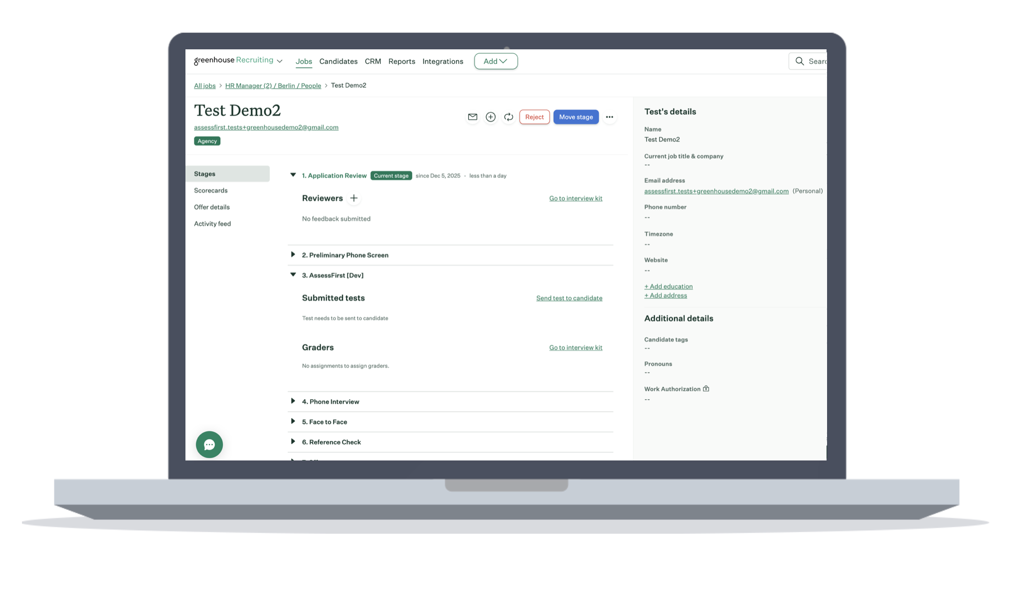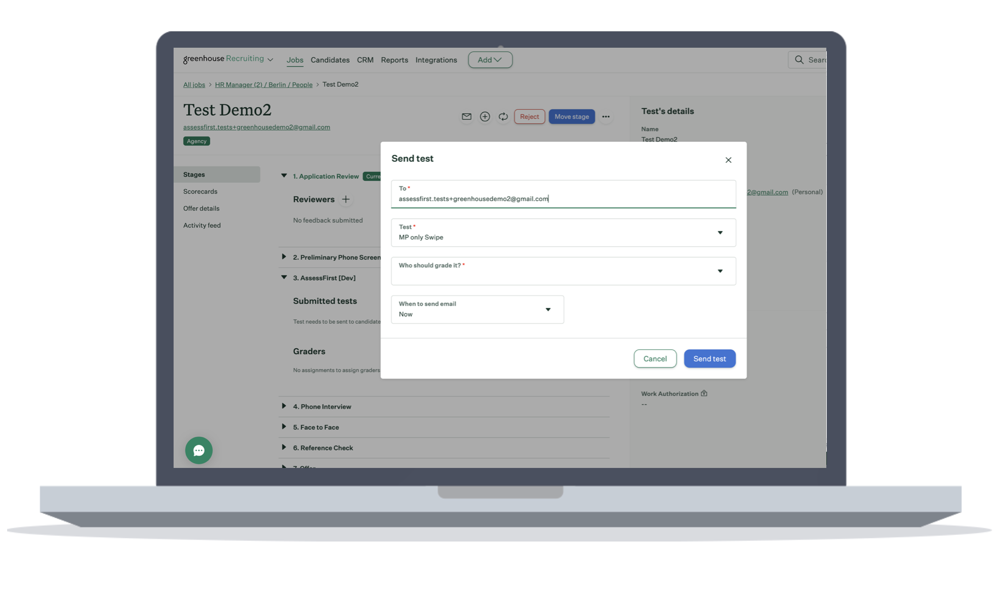 3. In the AssessFirst stage, click on “Send test to candidate”.