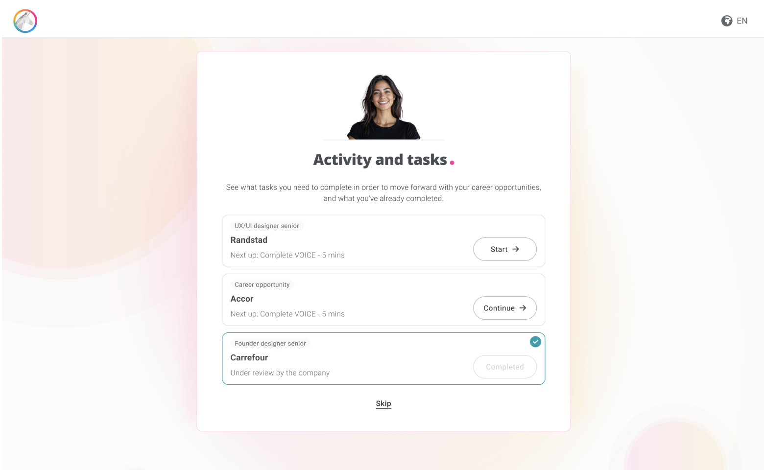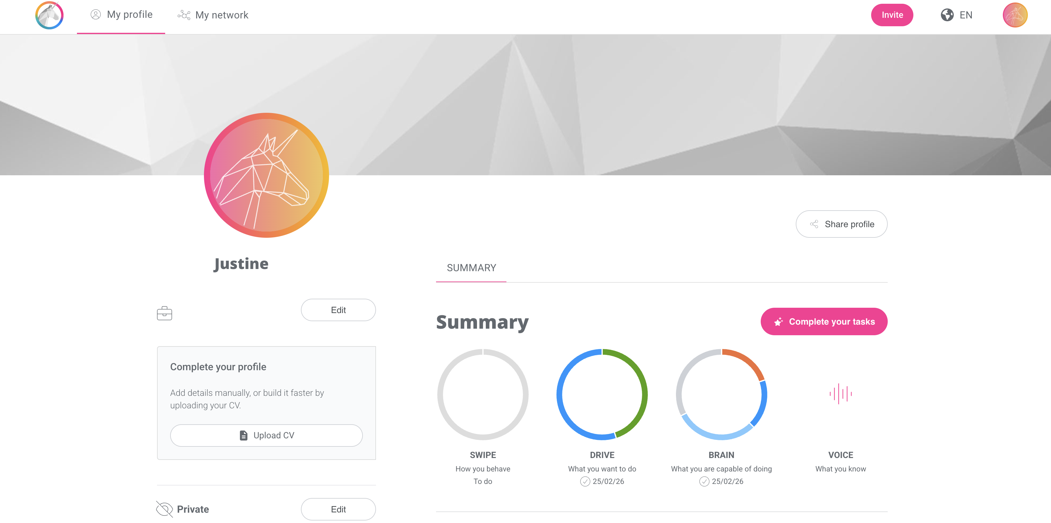 5. Once done, you can then move on to the other questionnaires (SWIPE, DRIVE, BRAIN, VOICE) requested by the recruiter.