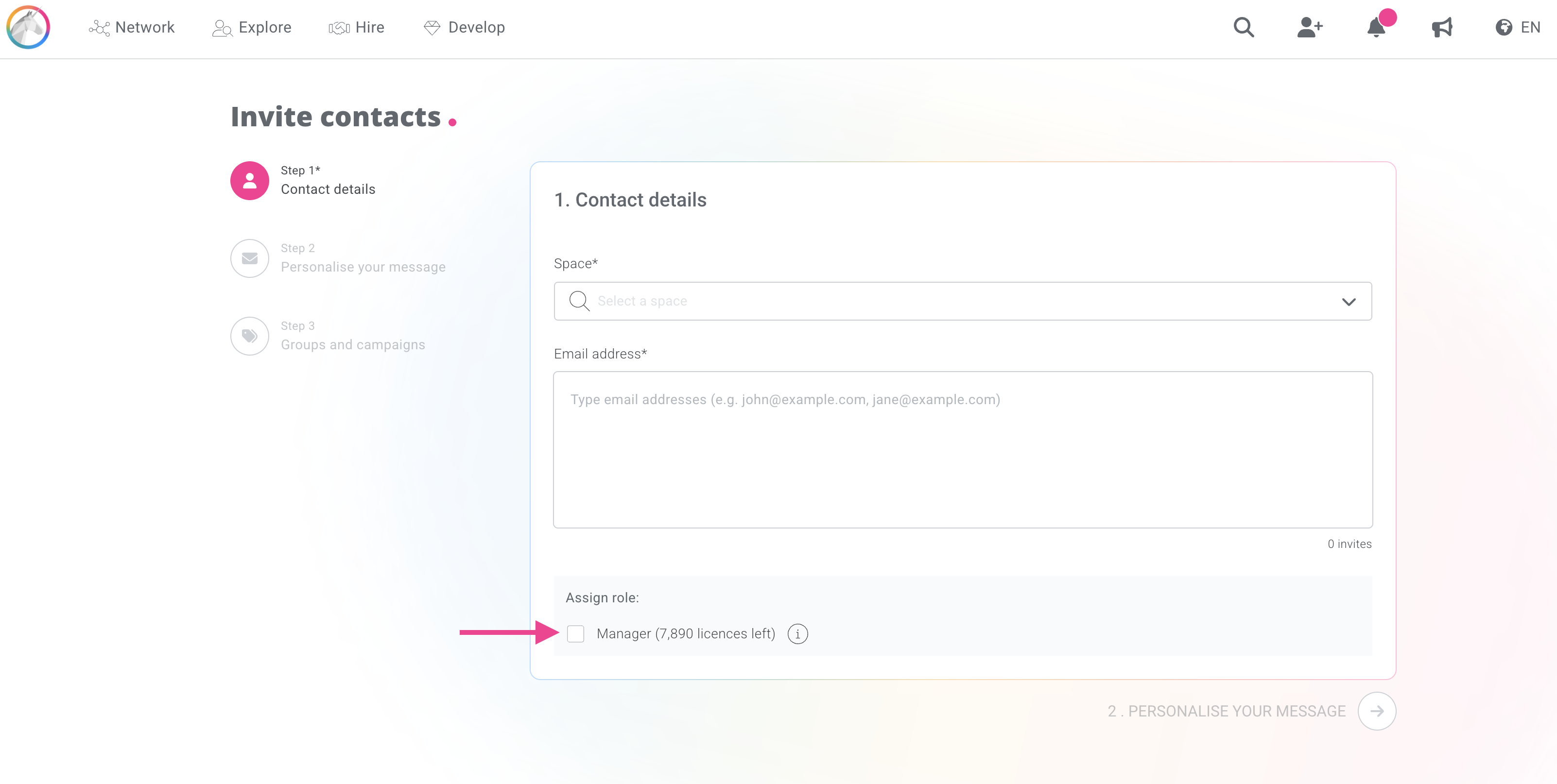 - At the bottom of the invitation page, you can check the “Manager” box and see how many Manager licenses are left