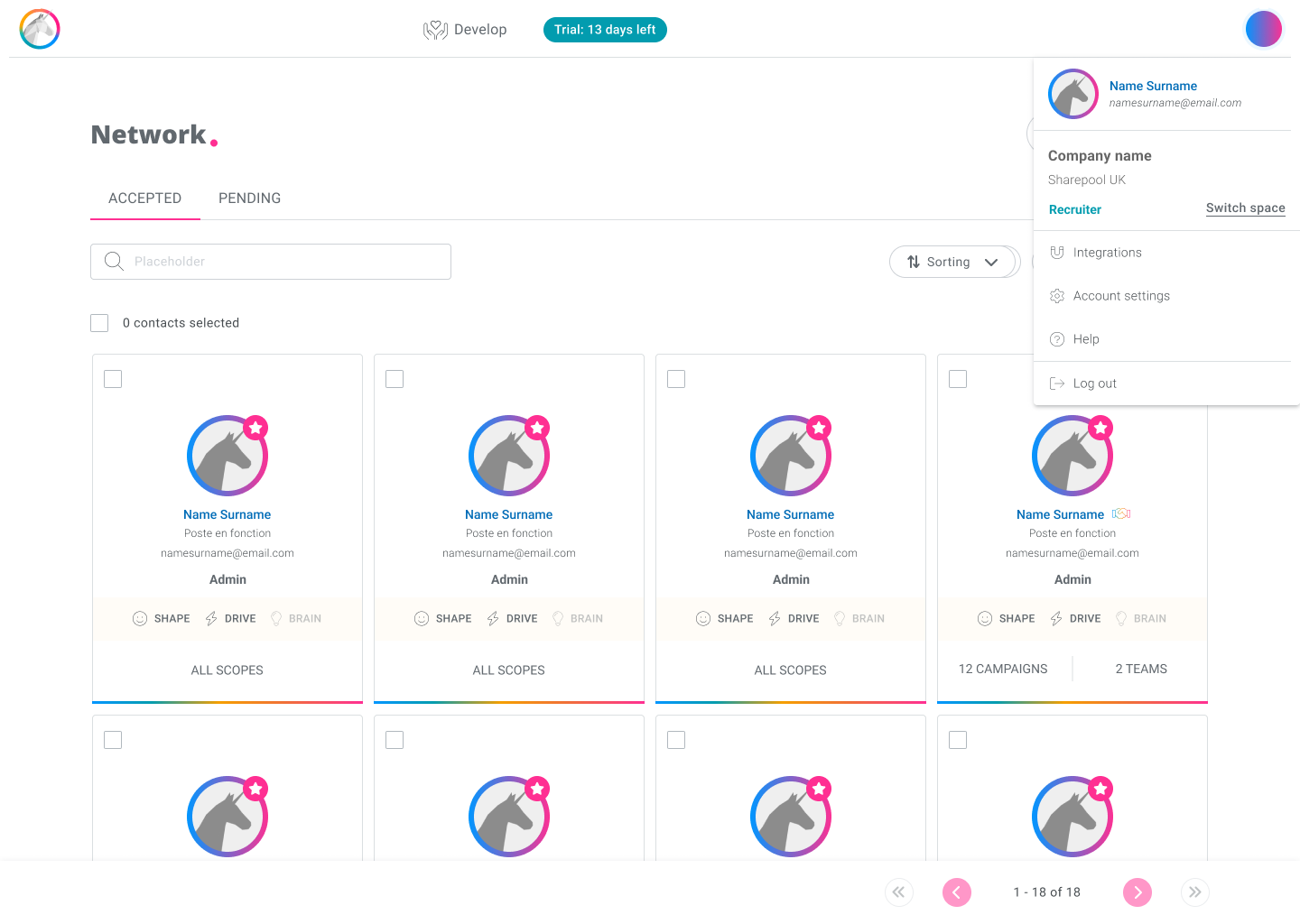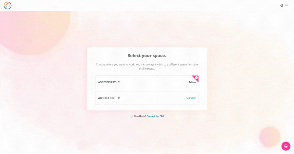 At any time, from any page on the platform, a user with Admin and/or Recruiter rights can switch from one space to another directly from the menu of their avatar in the top right-hand corner.