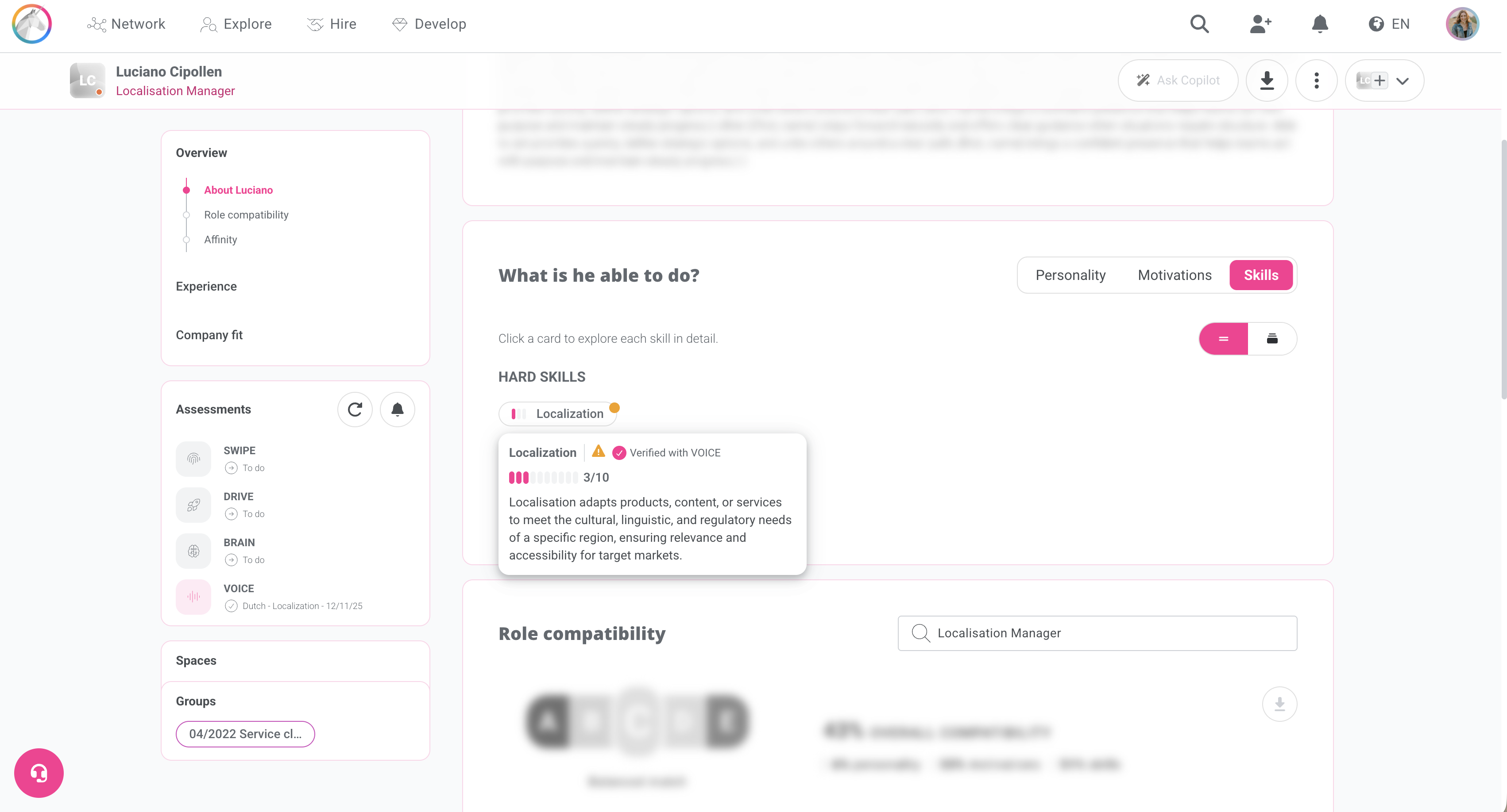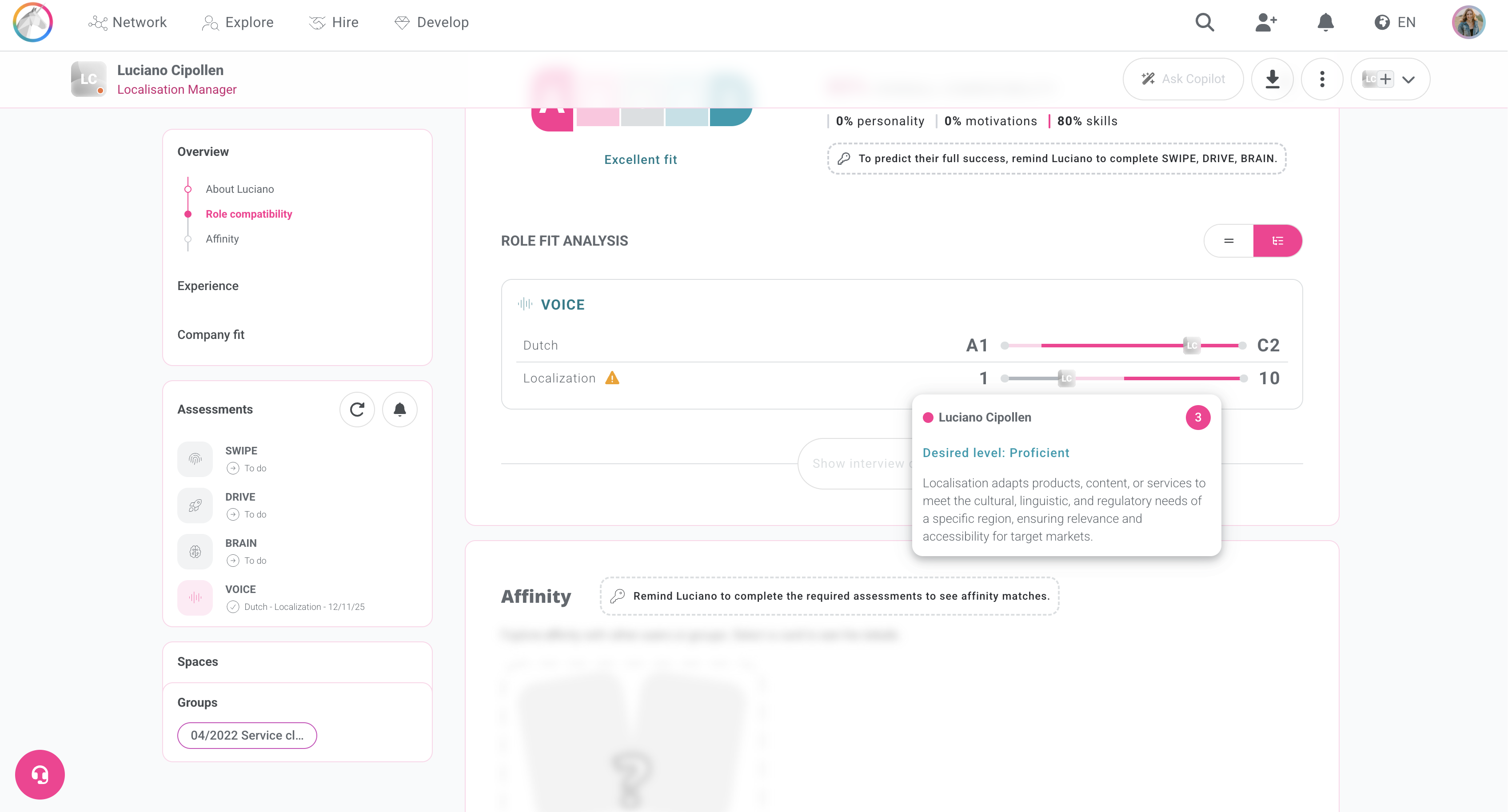 The “Role Compatibility” tab provides an analytical and comparative view of the VOICE results for each language or skill assessed within the selected predictive model: