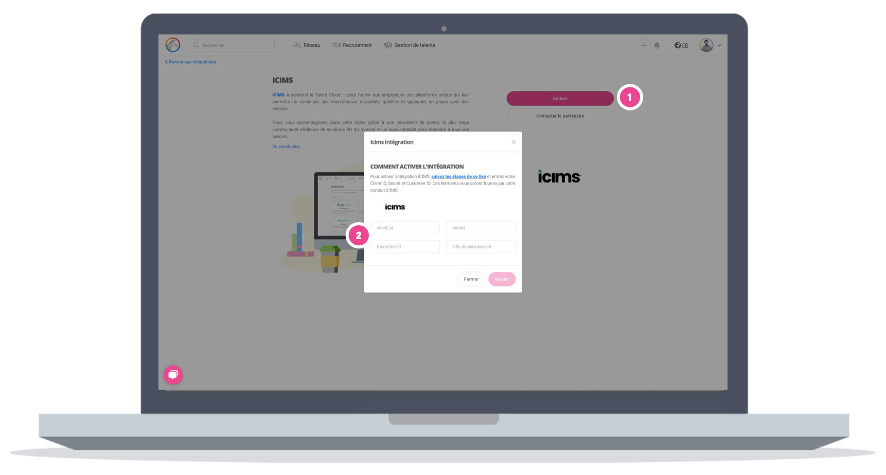 - Allez activer votre intégration dans l'application AssessFirst, onglet "Intégration"," en indiquant les informations qu'Icims vous aura fournies