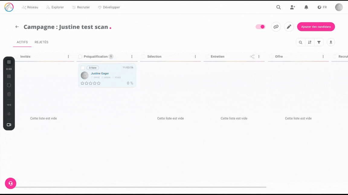 Pour rejeter une candidature : cliquez sur la carte → "Rejeter" → option d’envoyer un email de refus. Le candidat disparaît alors de la campagne.