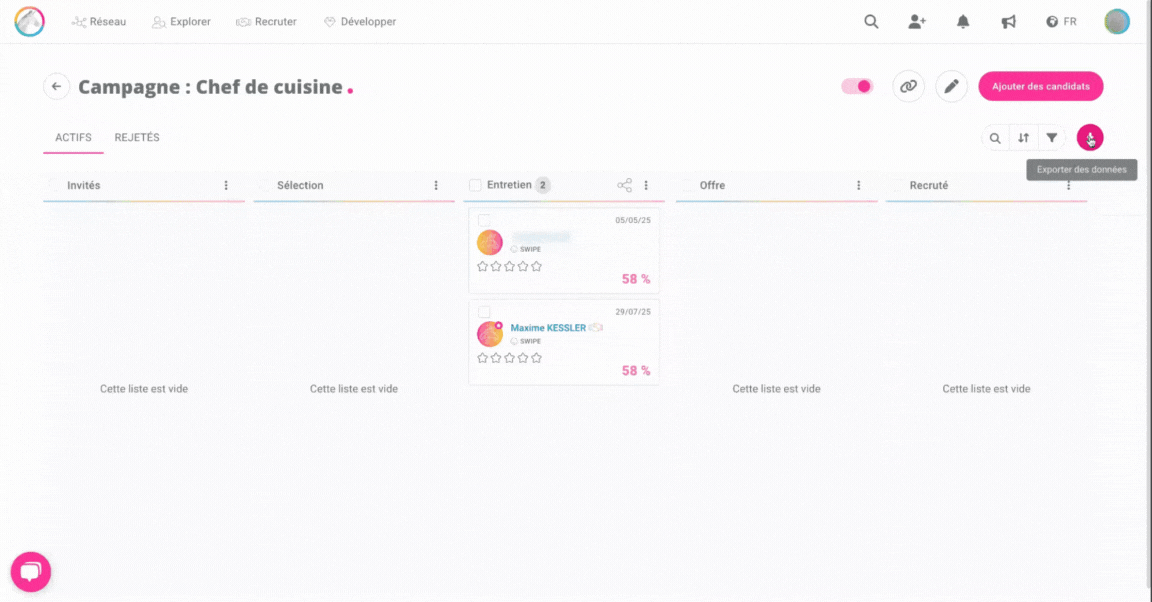 La fonction d'exportation, accessible depuis les onglets "Actifs" et "Rejetés", vous permet de télécharger les données de la campagne afin de les partager, de les analyser ou d'établir un rapport sur les progrès des candidats.