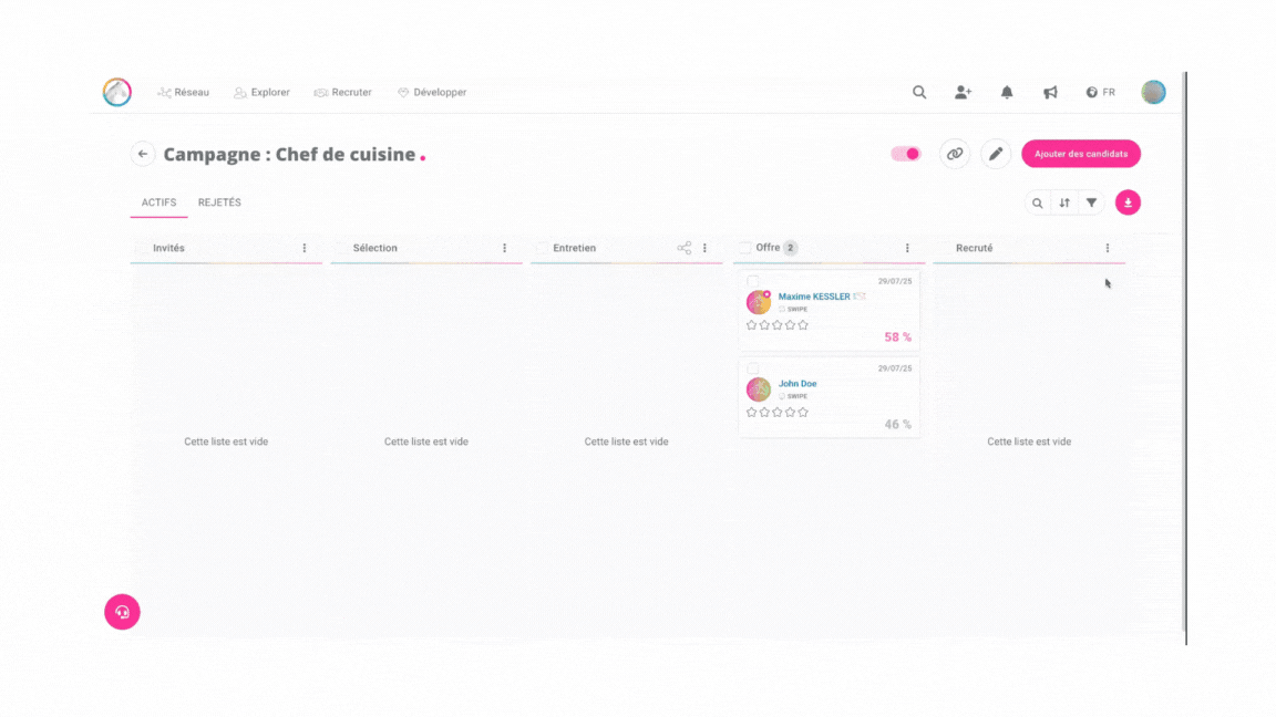 Pour faire avancer un candidat : glissez sa carte dans une autre colonne.