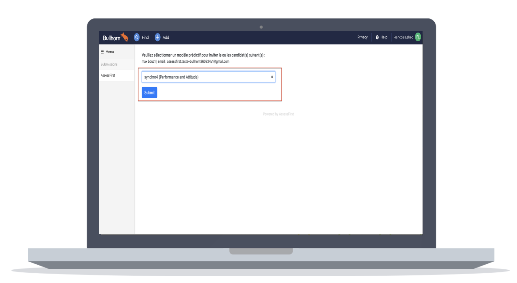 À chaque fin de passation d'un questionnaire, les résultats seront directement visibles dans la partie "Submission" du candidat.