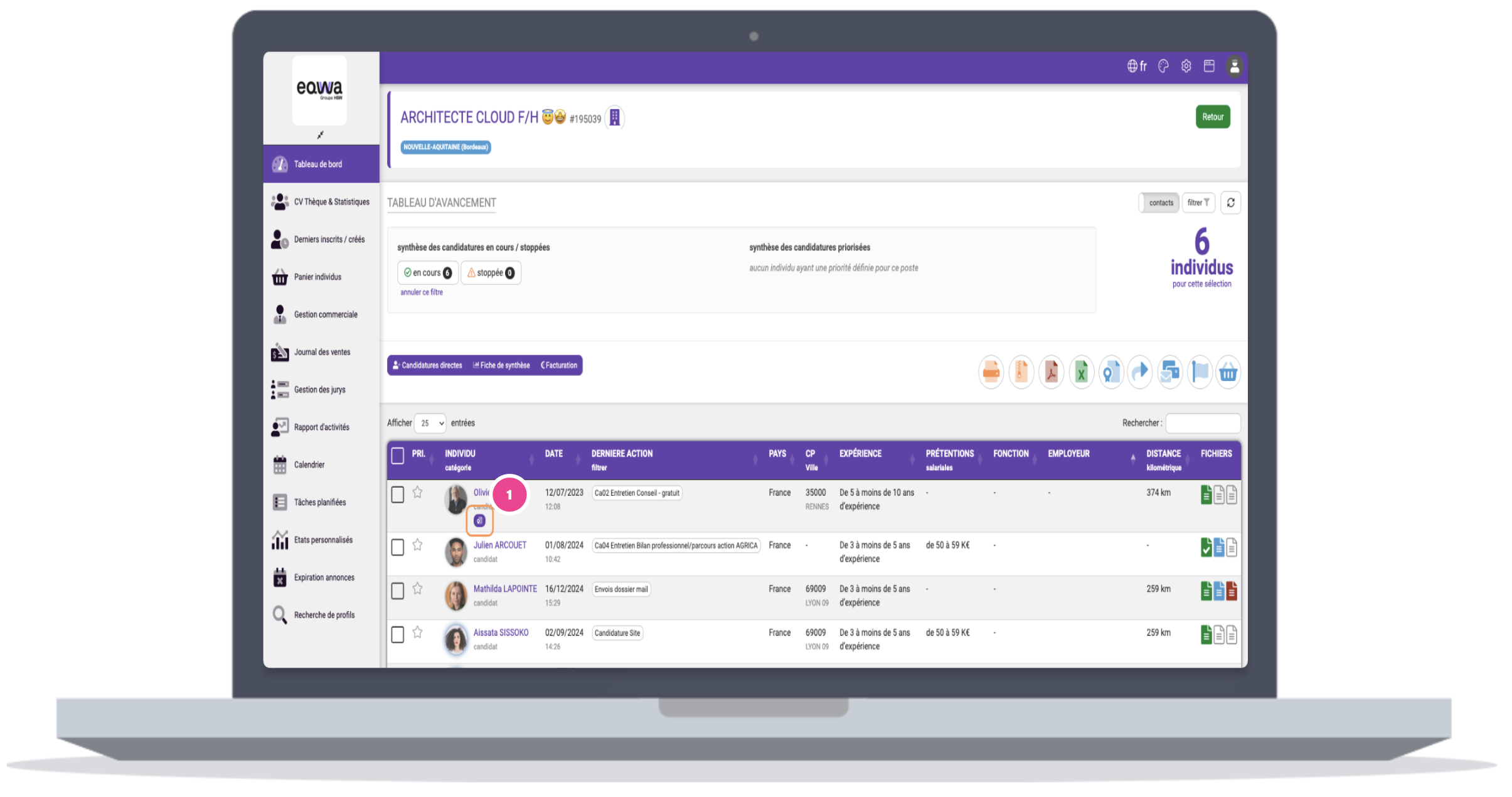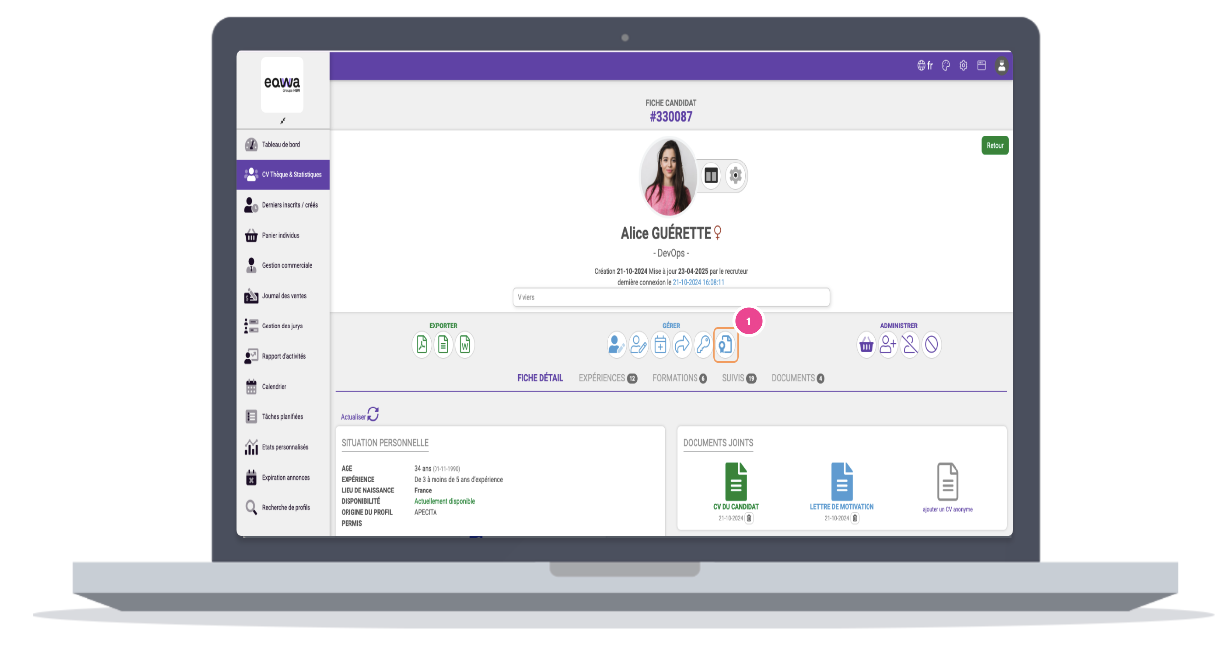 Vous pouvez cliquer sur ce pictogramme (1) pour accéder directement au profil AssessFirst du candidat.