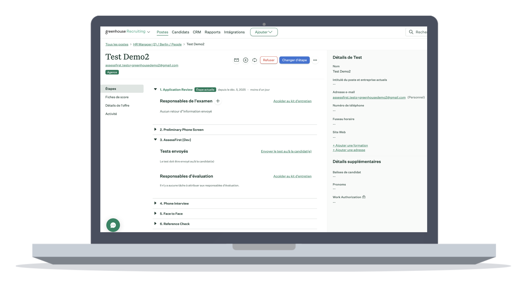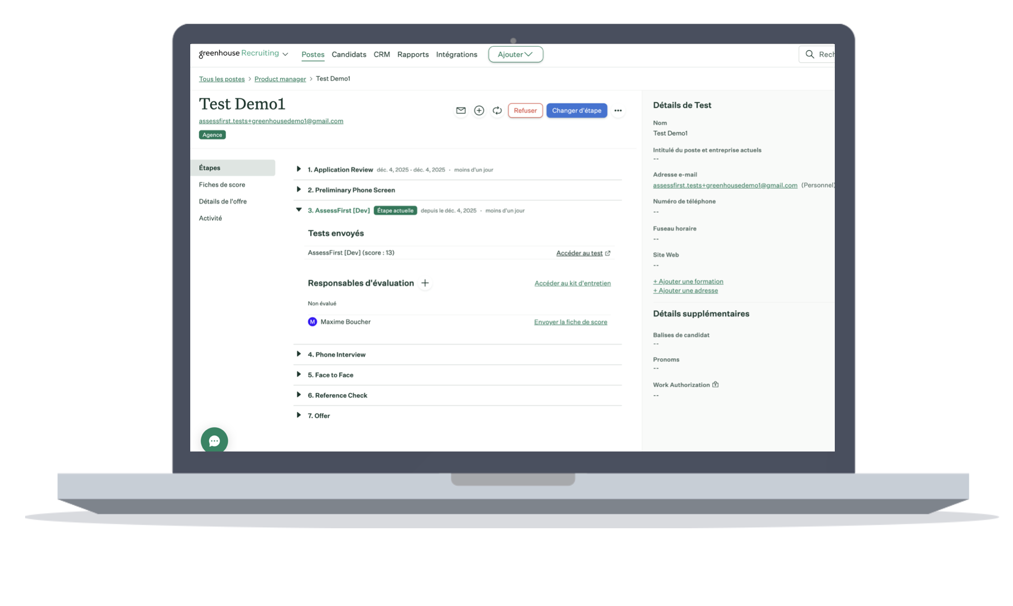 1. Une fois les évalutions effectuées par le candidat, vous pouvez retourner sur la fiche du candidat dans Greenhouse.