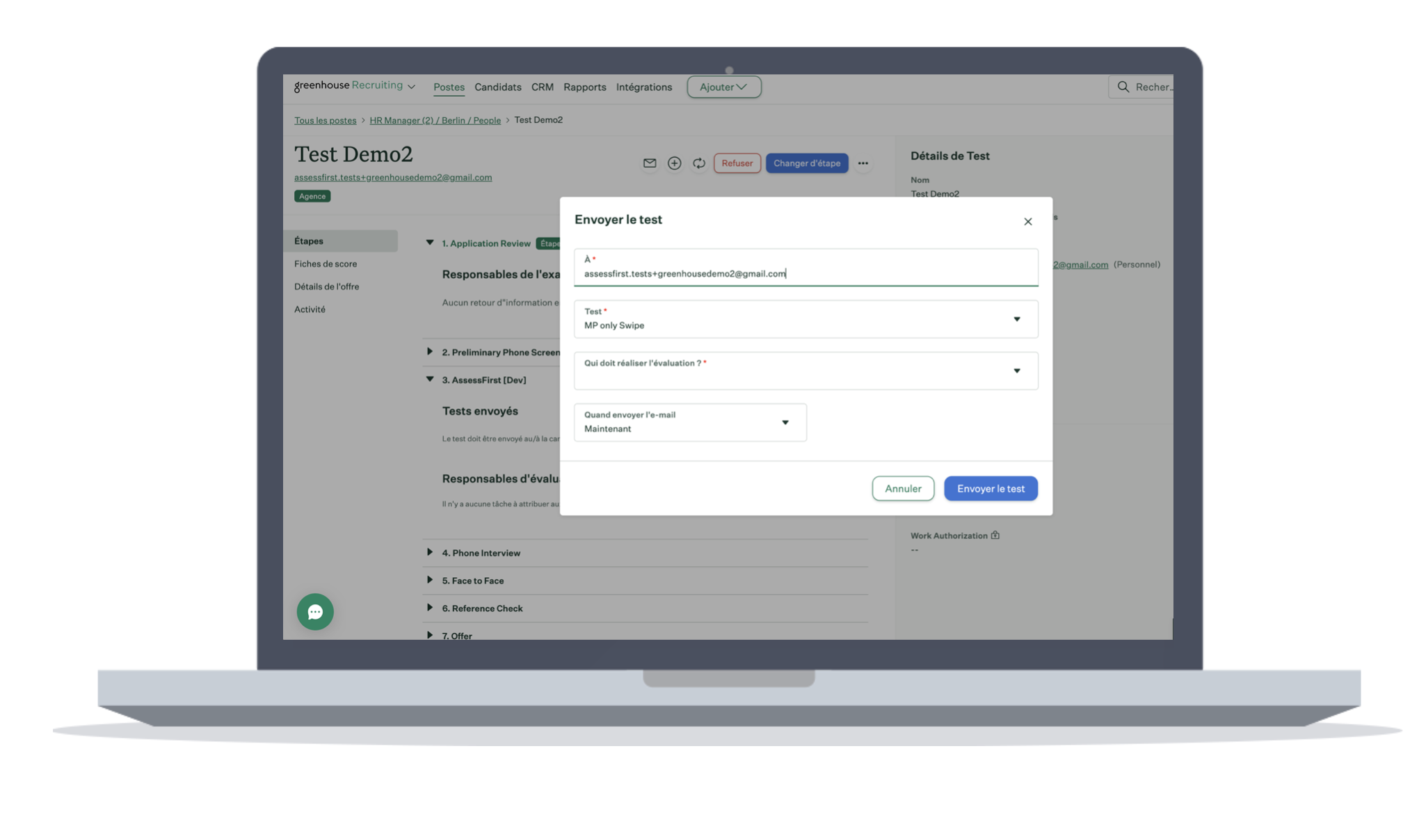 3. Dans le stage AssessFirst, cliquez sur "Envoyer le test au/à la candidat(e)".