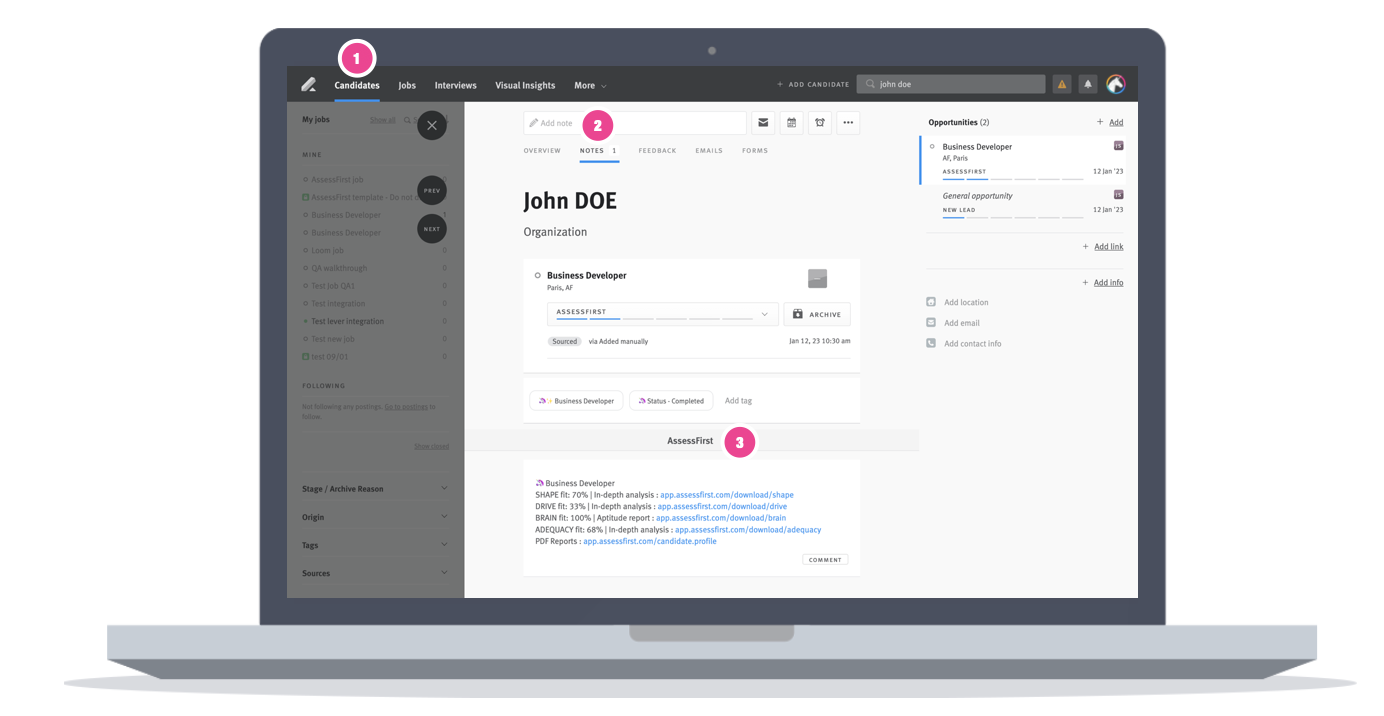 Lorsque le candidat aura terminé les questionnaires, le tag AssessFirst changera en « Completed ».