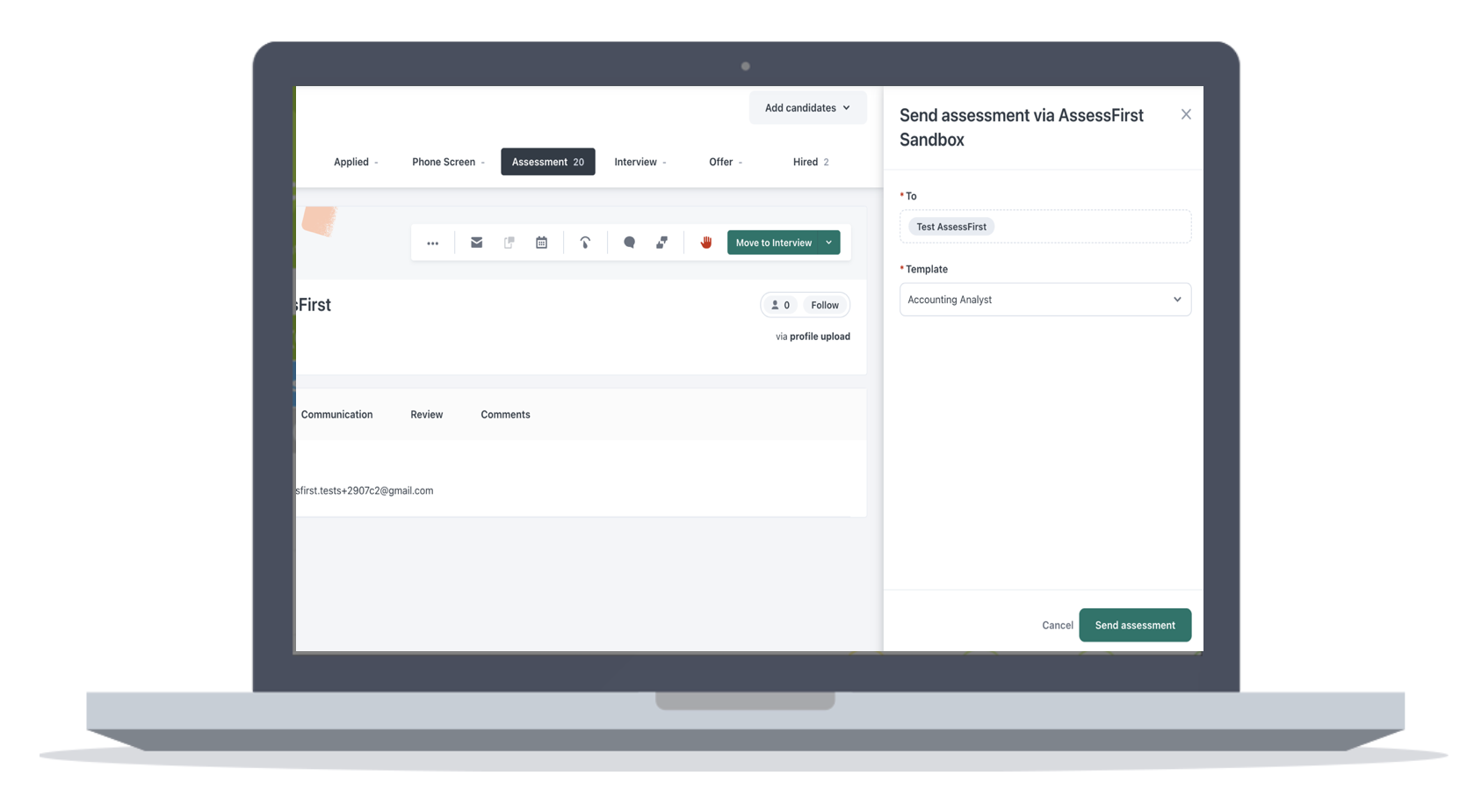 Pour envoyer une invitation, il faut obligatoirement que votre candidat soit dans le statut "Assessment".