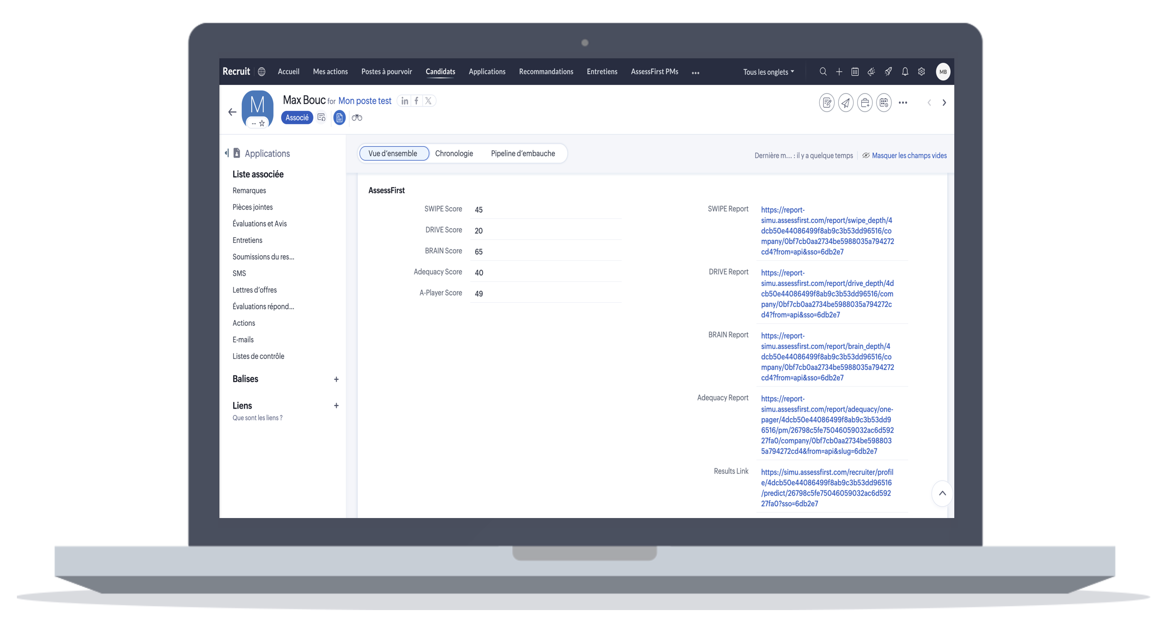 1. Allez sur le profil du candidat, dans l'onglet principal "Vu d'ensemble", vous trouver la section AssessFirst avec tous les résultats.
