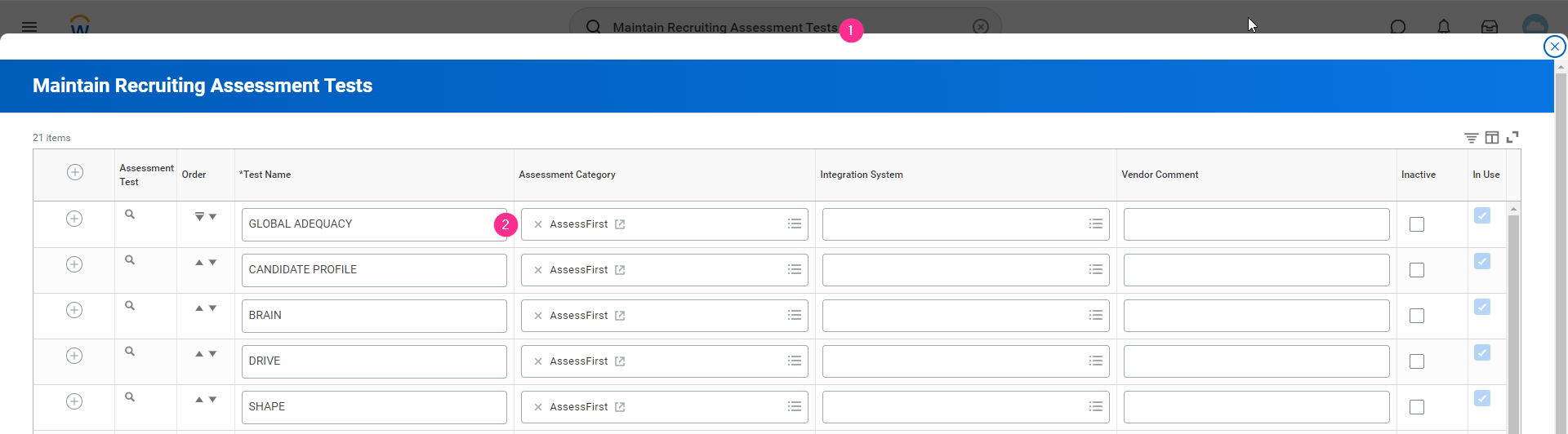 - Une fois créés, allez sur la loupe (deux fois) et éditez leur intégration/référence ID avec respectivement "assessfirst-Swipe", "assessfirst-drive", "assessfirst-brain" et "assessfirst-adequacy".