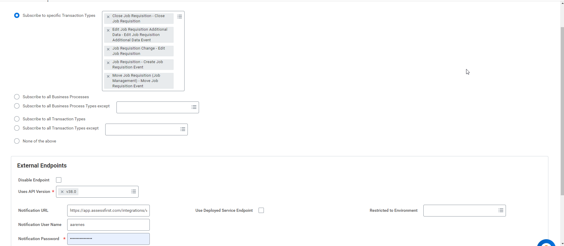 - Sélectionnez "Subscribe to specific Transaction Types" et ajoutez les transactions suivantes : "Fermer la demande d'emploi", "Modifier les données supplémentaires de la demande d'emploi", "Modifier la demande d'emploi", "Créer un événement de demande d'emploi" et "Déplacer la demande d'emploi".