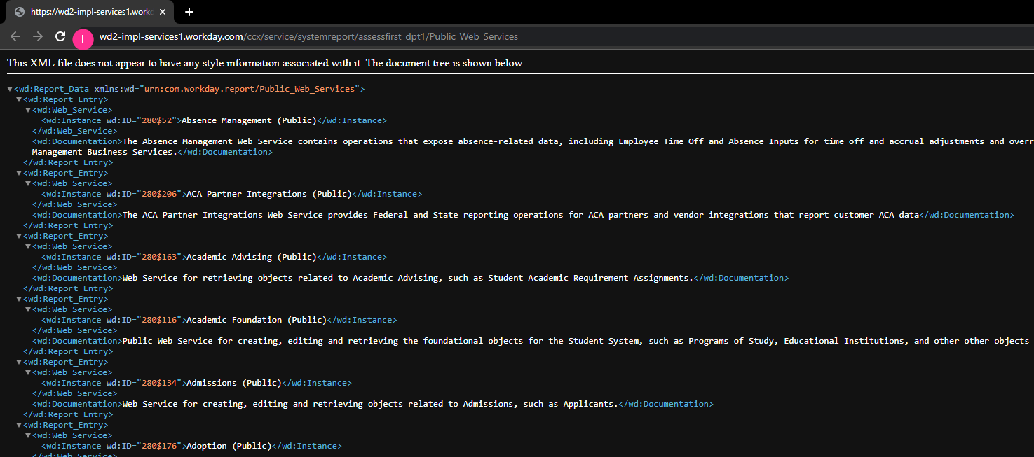 - Sélectionnez l'URL en bas de page jusqu'à "service", l'URL doit être "https://wd2-impl-services1.workday.com/ccx/service".