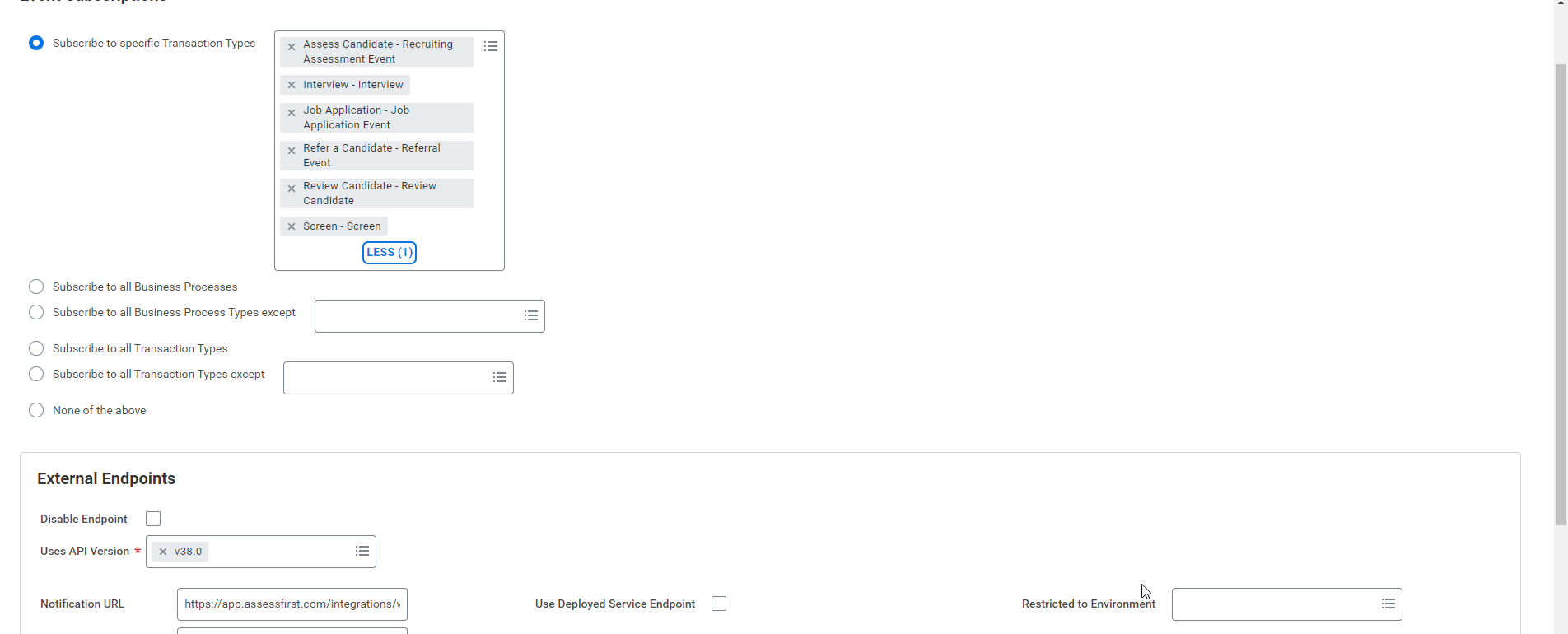 - Sélectionnez "Subscribe to specific Transaction Types" et ajoutez les transactions suivantes : "Évaluer le candidat - Événement d'évaluation de recrutement", "Entretien - Entretien", "Demande d'emploi - Événement de demande d'emploi", "Recommander un candidat - Événement de recommandation", "Examiner le candidat - Examen du candidat" et "Écran - Écran".