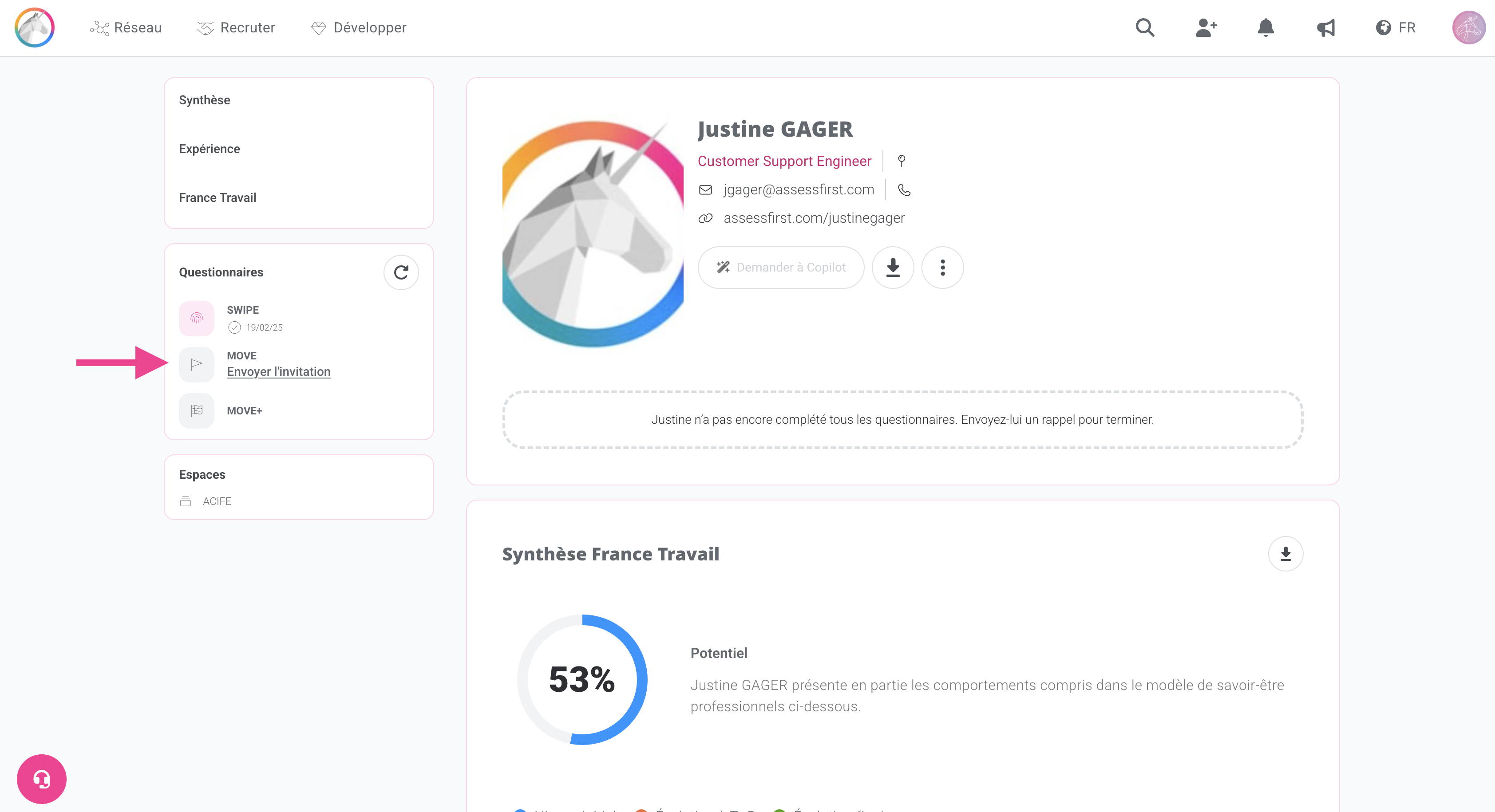 Une fois le questionnaire SWIPE terminé, vous aurez la possibilité d'envoyer une invitation directement sur le profil du candidat. Pour cela, dans l'encart "Questionnaires" à gauche, cliquez sur "Envoyer l'invitation" :