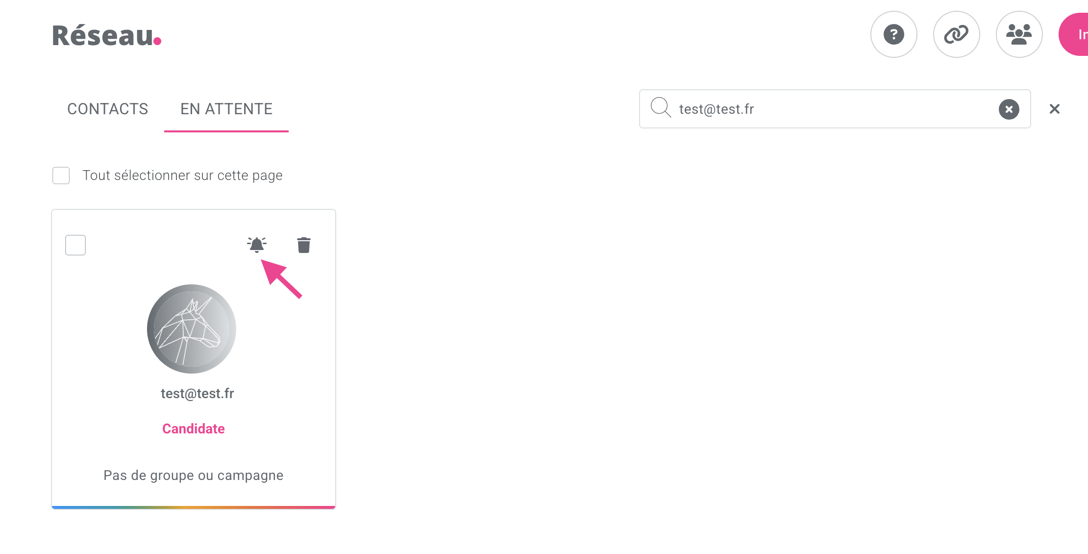 Si vous souhaitez relancer un candidat qui se trouve dans vos contacts en attente, vous pouvez cliquer sur la cloche qui se situe en haut à droite :