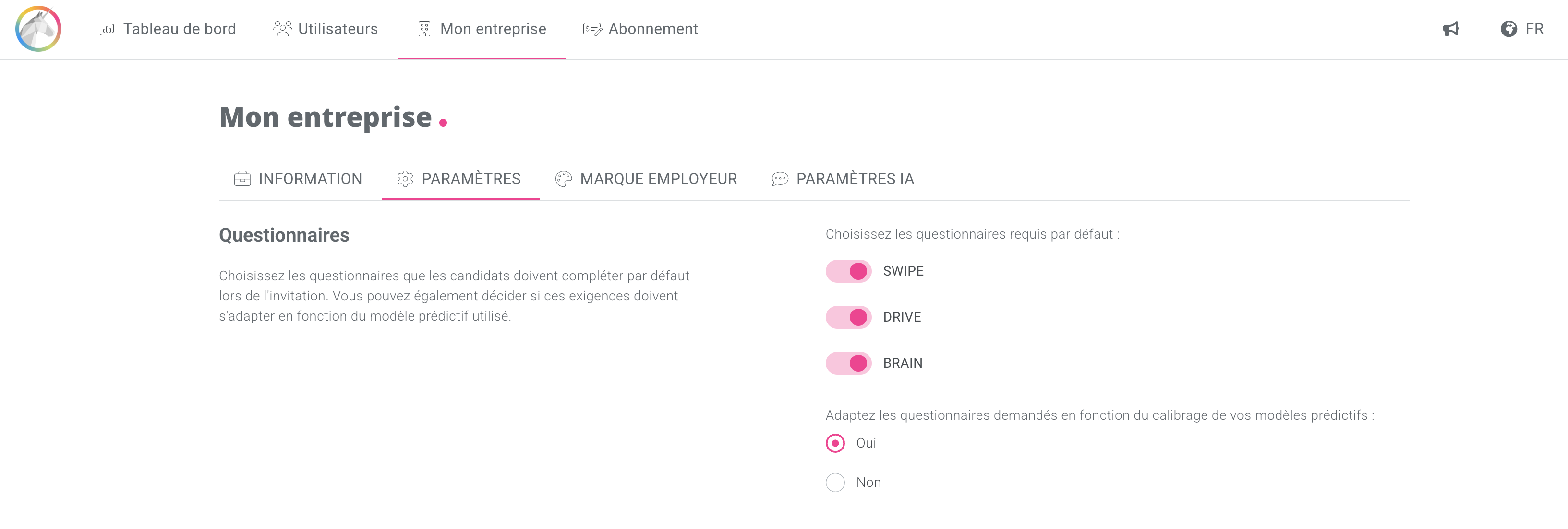 Au préalable, dans l'espace Admin, vous devez avoir coché "Oui" à "Adaptez les questionnaires demandés en fonction du calibrage de vos modèles prédictifs" qui se trouve dans l'onglet "Mon entreprise" > "Paramètres" :