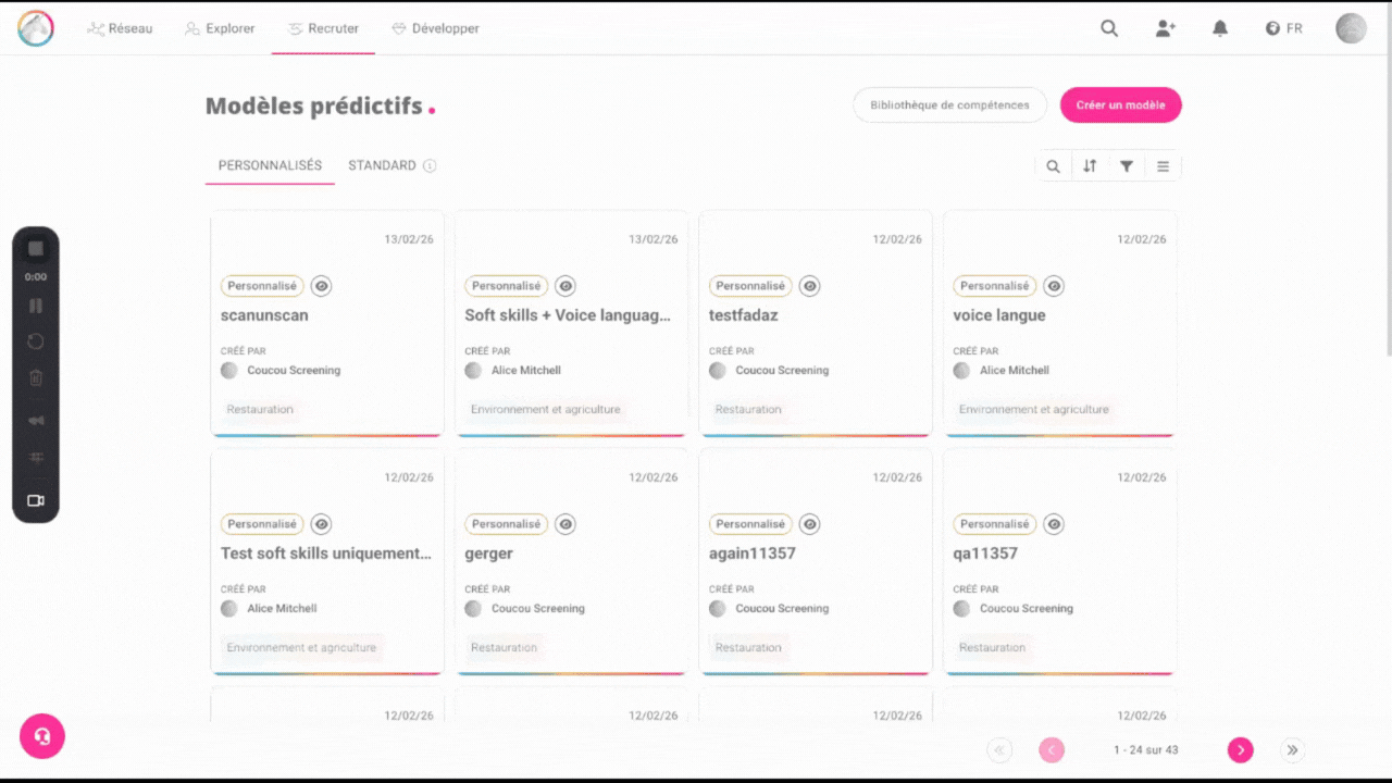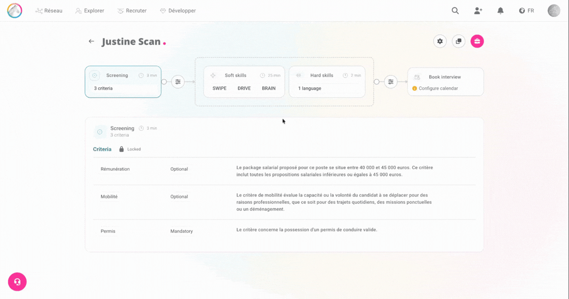 Nous y avons ajouté récemment SCAN qui vous permet de faire une pré-sélection des candidats sur des critères prédéfinis avant de passer aux modules "Compétences comportementales" (soft skills), "Compétences techniques" (hard skills) et "Prendre un rendez-vous".
