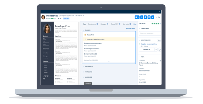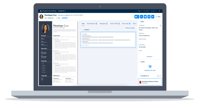 Une fois l’évaluation complétée par le candidat, l’utilisateur à l’origine de la demande reçoit une notification. Un rapport est alors automatiquement généré et disponible dans le bloc Documents (colonne de droite) ou via l’onglet Activités de la fiche candidat.