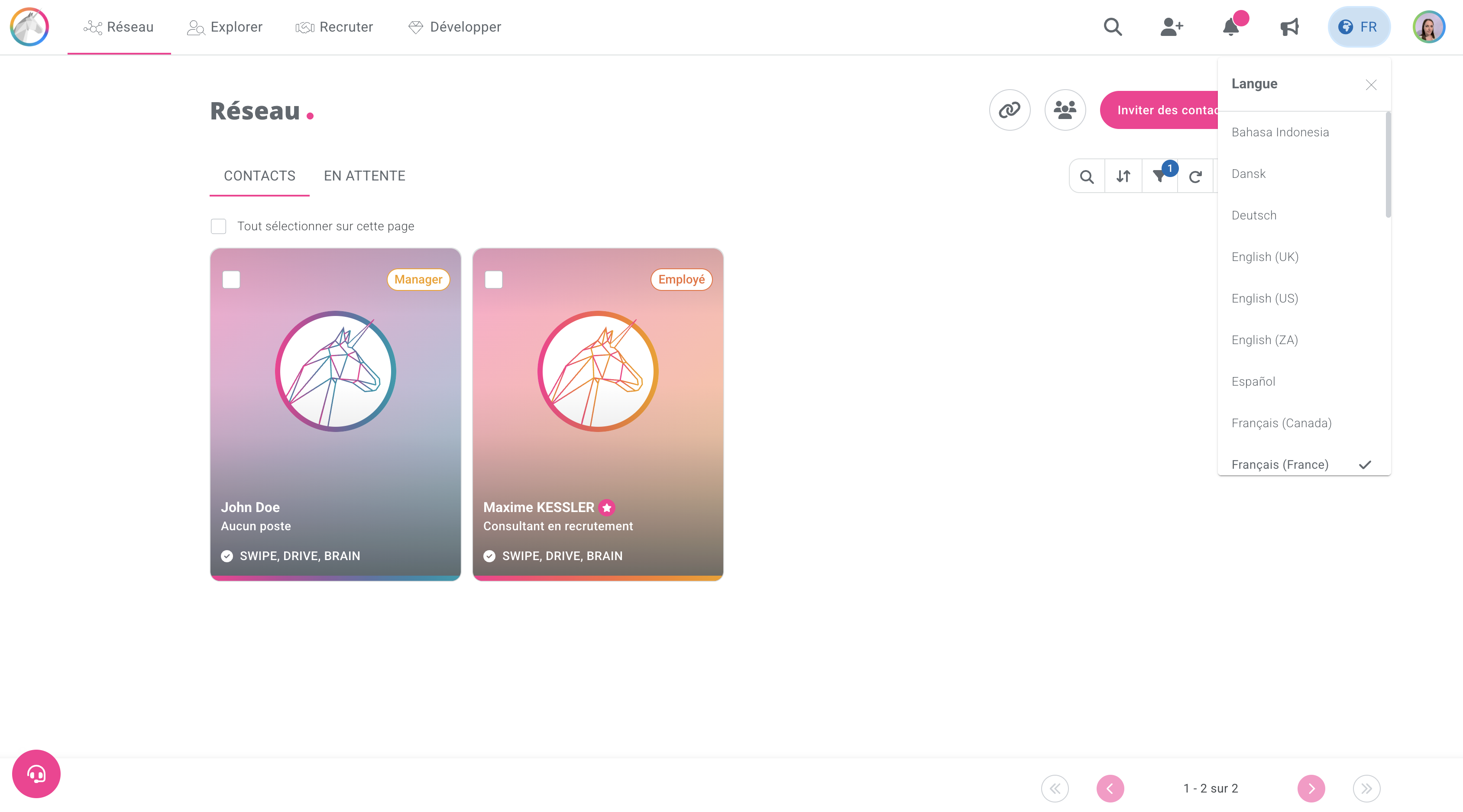 Pour modifier la langue de votre compte, vous devez cliquer sur la petite planète en haut à droite de votre compte AssessFirst. Un menu déroulant va s'ouvrir, vous avez le choix parmi 30 langues.