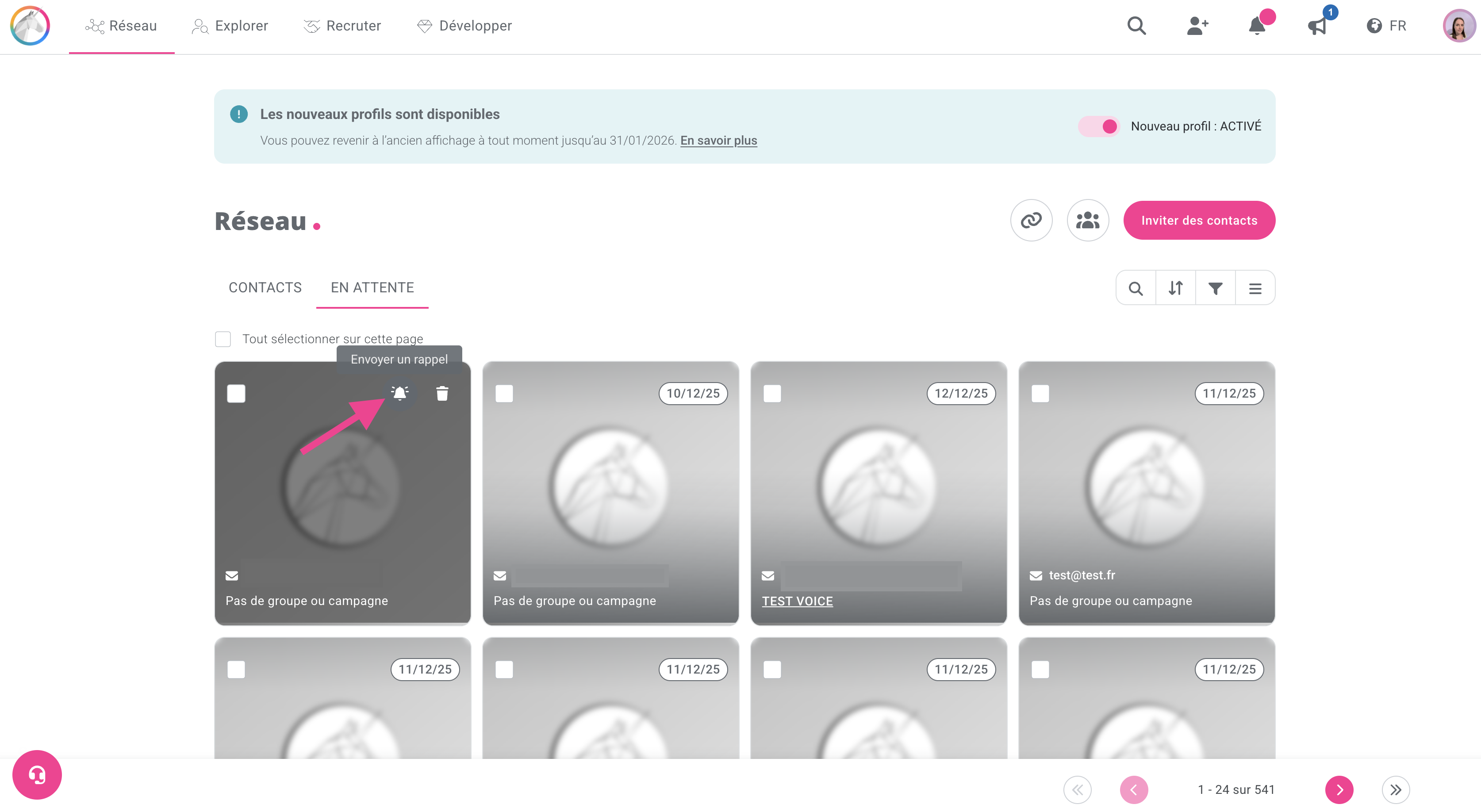 Cliquez sur l'onglet "En attente" dans votre réseau, recherchez votre bénéficiaire et cliquez sur "Envoyer un rappel".