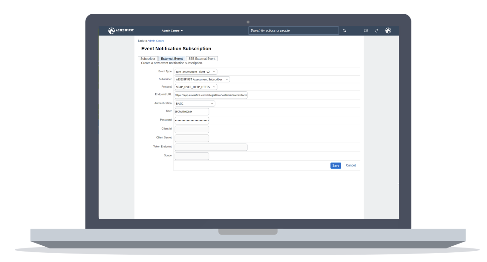 - URL du point final : https://app.assessfirst.com/integrations/webhook/successfactors (ou https://simu.assessfirst.com/integrations/webhook/successfactors si vous êtes sur un environnement de test)