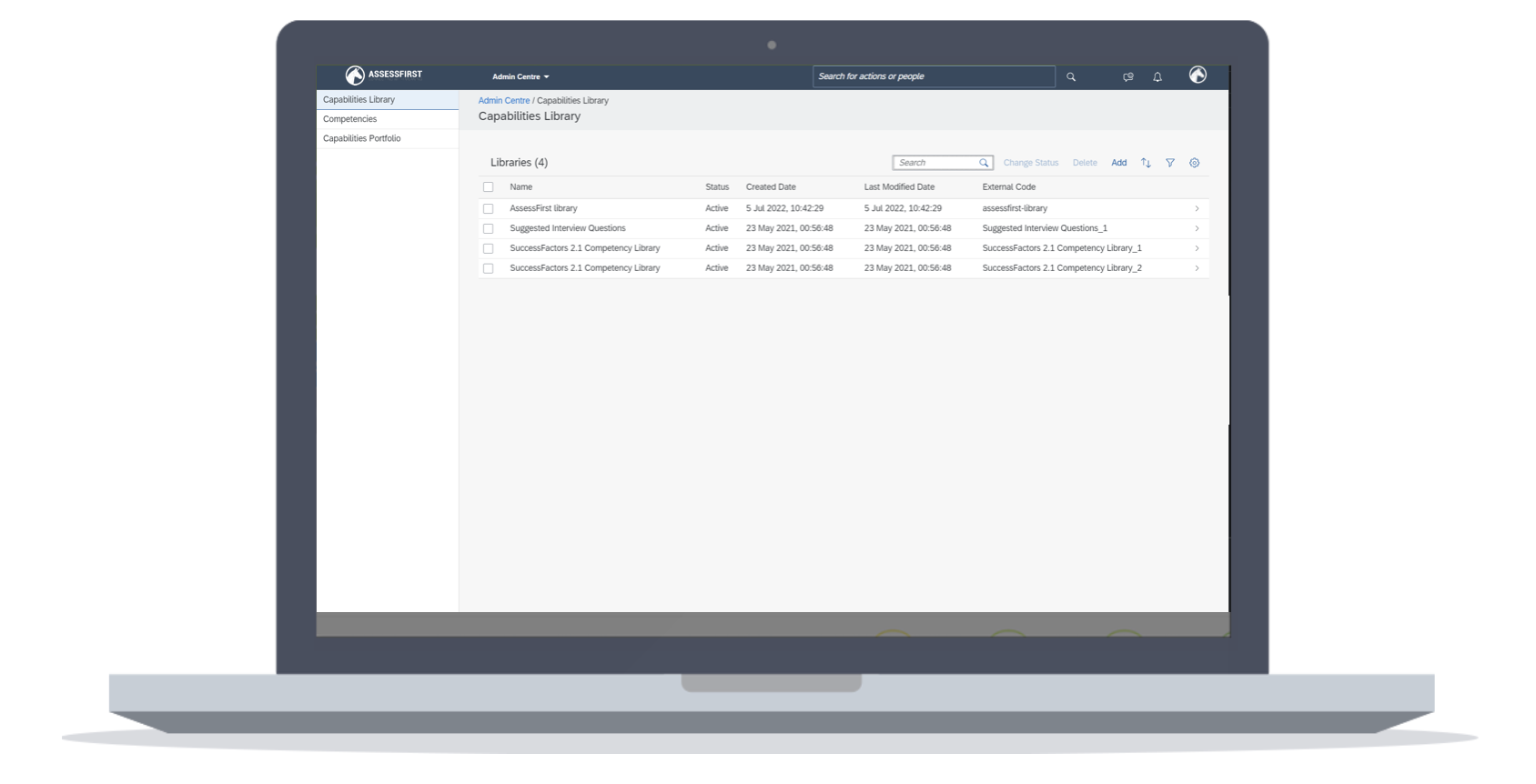 - Accédez à la page "Manager center of capabilities" et ajoutez une bibliothèque nommée "AssessFirst library" avec le code externe "assessfirst-library".